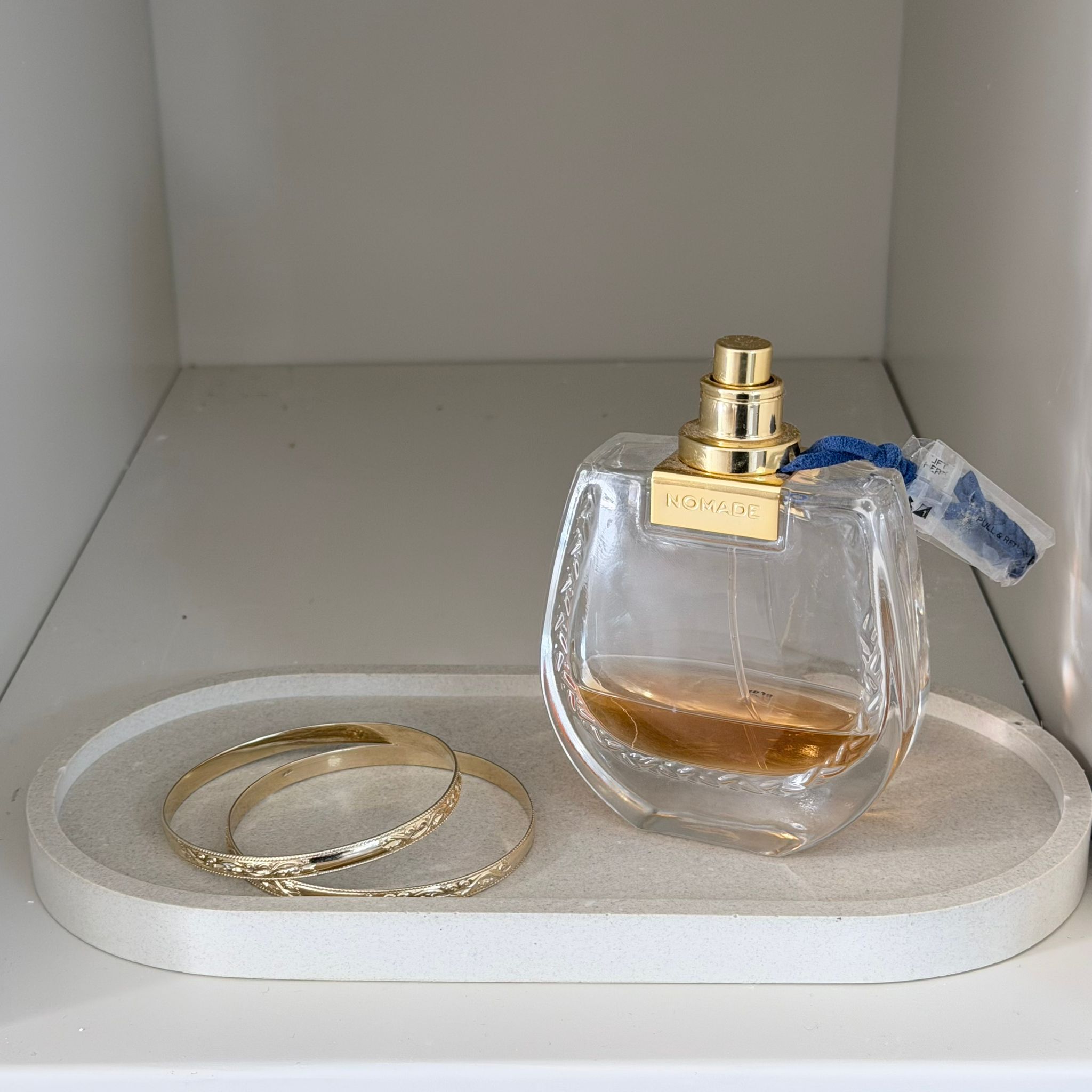העיצוב הנקי והצורה האובלית הופכים אותו לפריט ורסטילי – מתאים להנחת תכשיטים, בושם, נרות או כאובייקט דקורטיבי בפני עצמו.