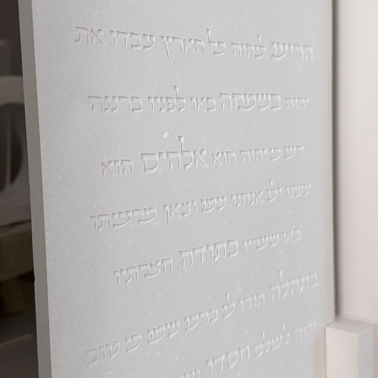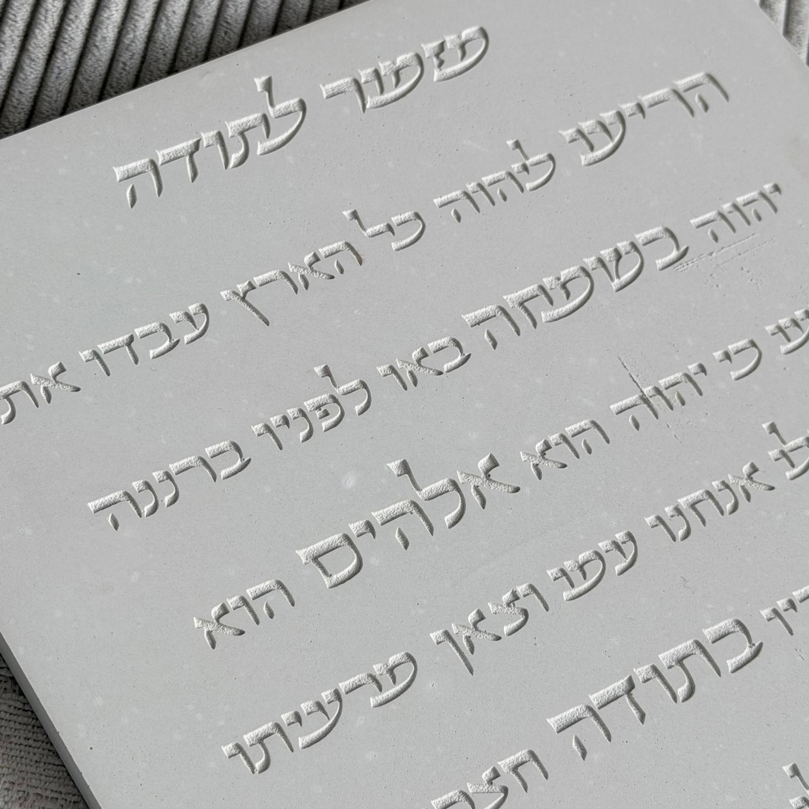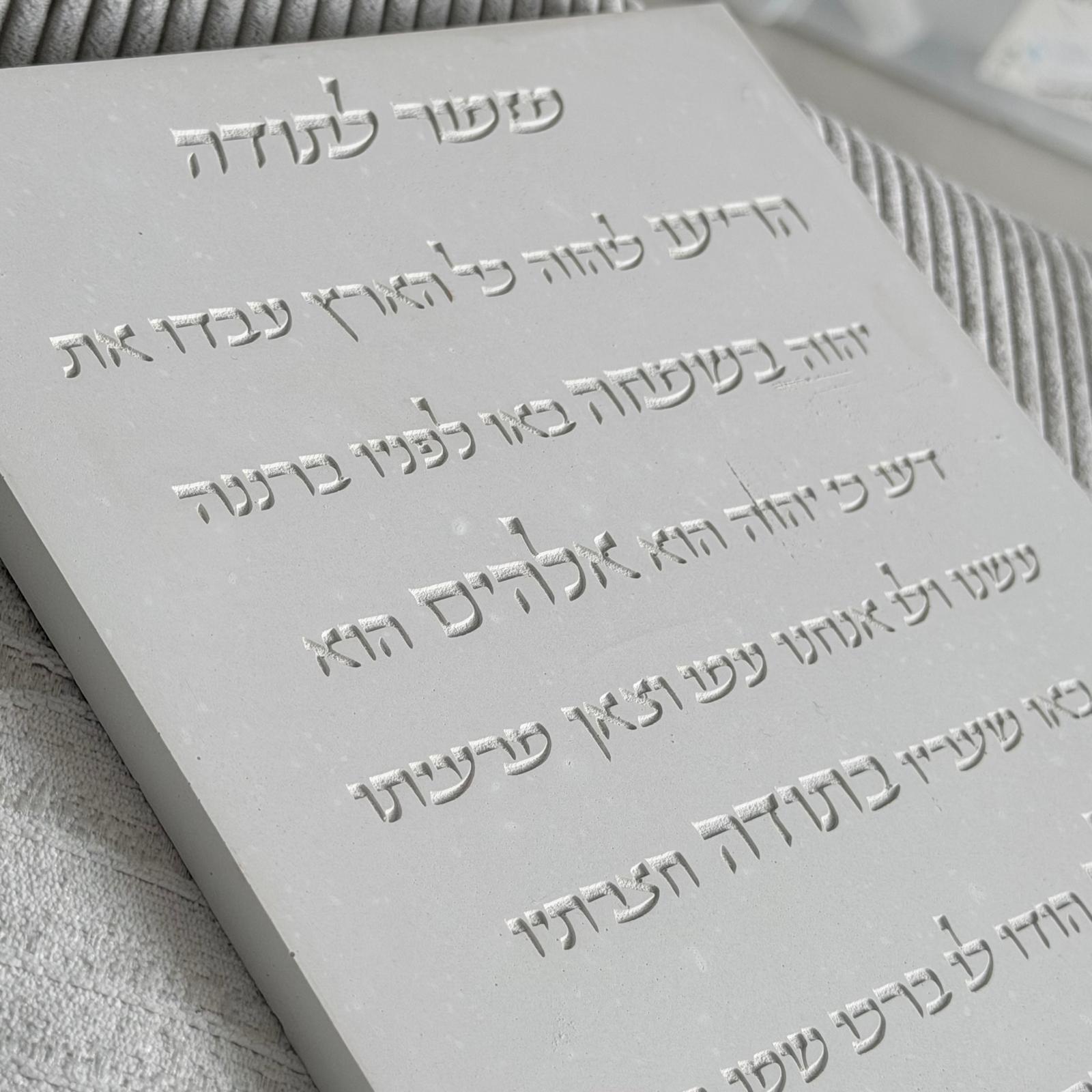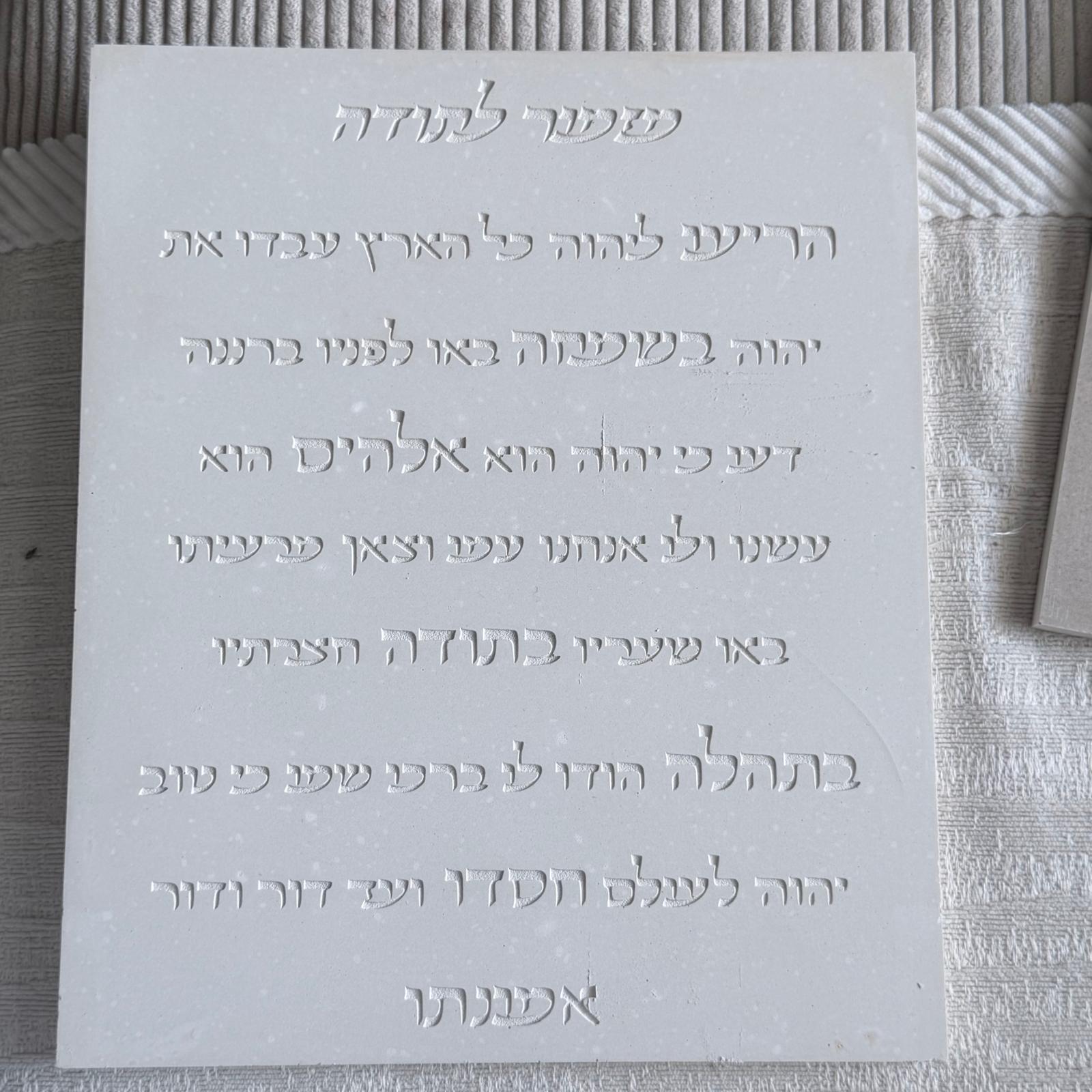לוח מזמור לתודה בגוון לבן בטון בעיצוב שקט ועל־זמני, עם טקסט מוטבע בתבנית בקווים עדינים ונוכחות רכה.